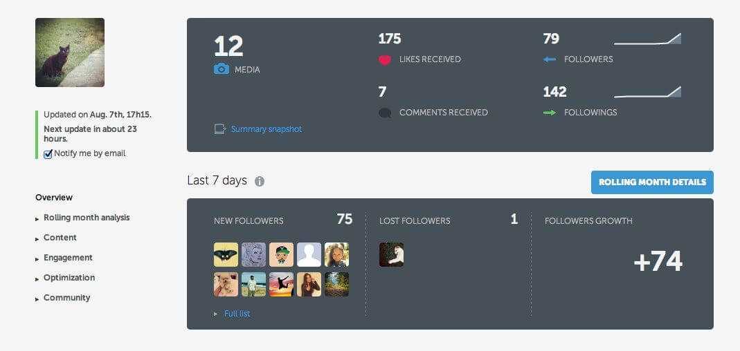 Сервис позволяет вести статистику и аналитику по Instagram. Основное его преимущество состоит в том, что он отображает наиболее популярные посты с наибольшим количеством лайков или комментариев за всё время. Есть рекомендации по времени для будущих постов. Можно найти и проанализировать профили самых активных подписчиков.