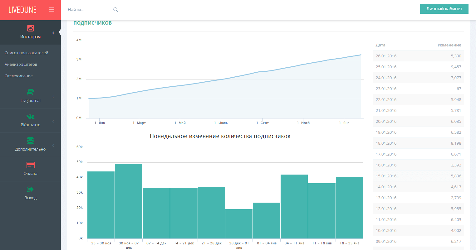 Более доступная альтернатива Iconsguare и Sprout Social — русскоязычный сервис LiveDune. Он стоит от 400 рублей в месяц, предлагает тот же набор возможностей плюс интегрируется с Одноклассниками и ВКонтакте.