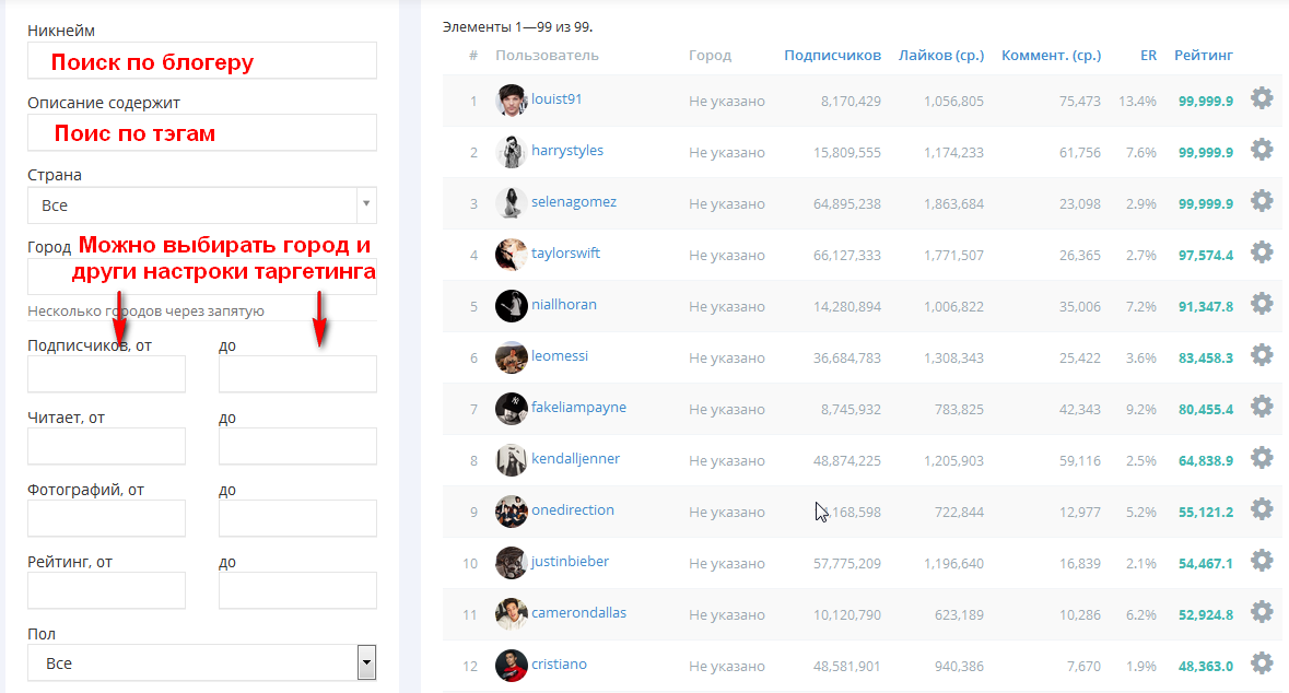 Информация об общем рейтинге, таргетинг по странам и городам, тематический таргетинг: спорт, путешествия, видео-блоги, певцы и так далее, полное обновление статистики каждые 72 часа, отслеживание лайков, комментариев, подписчиков.