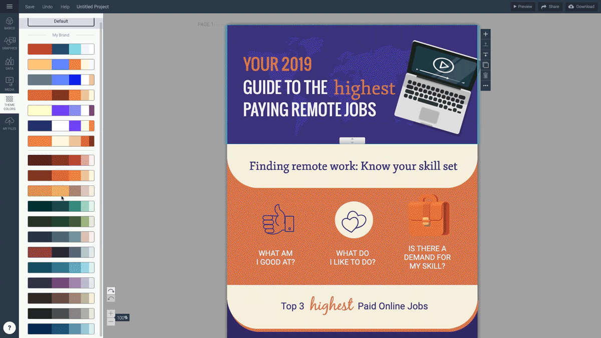 Просмотрите сотни бесплатных и премиальных шаблонов инфографики в панели инструментов, чтобы найти тот, который лучше всего подходит для ваших целей.