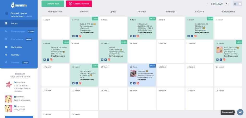 Главной страницей личного кабинета сервиса является календарь публикаций, в котором наглядно отображены опубликованные и запланированные посты и истории. В верхней части страницы можно переключаться между проектами. Там же находится панель уведомлений и меню аккаунта.