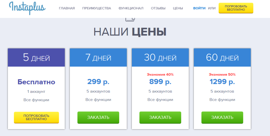- тариф на использование Инстаплюс в течение 60 дней с возможностью продвижения сразу пяти аккаунтов – 1299 рублей.