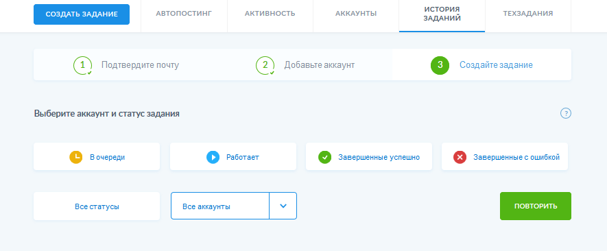 Для привязки жмем «добавить аккаунт» и следуем инструкциям. После данного действия мы уже сможем добавлять задания.