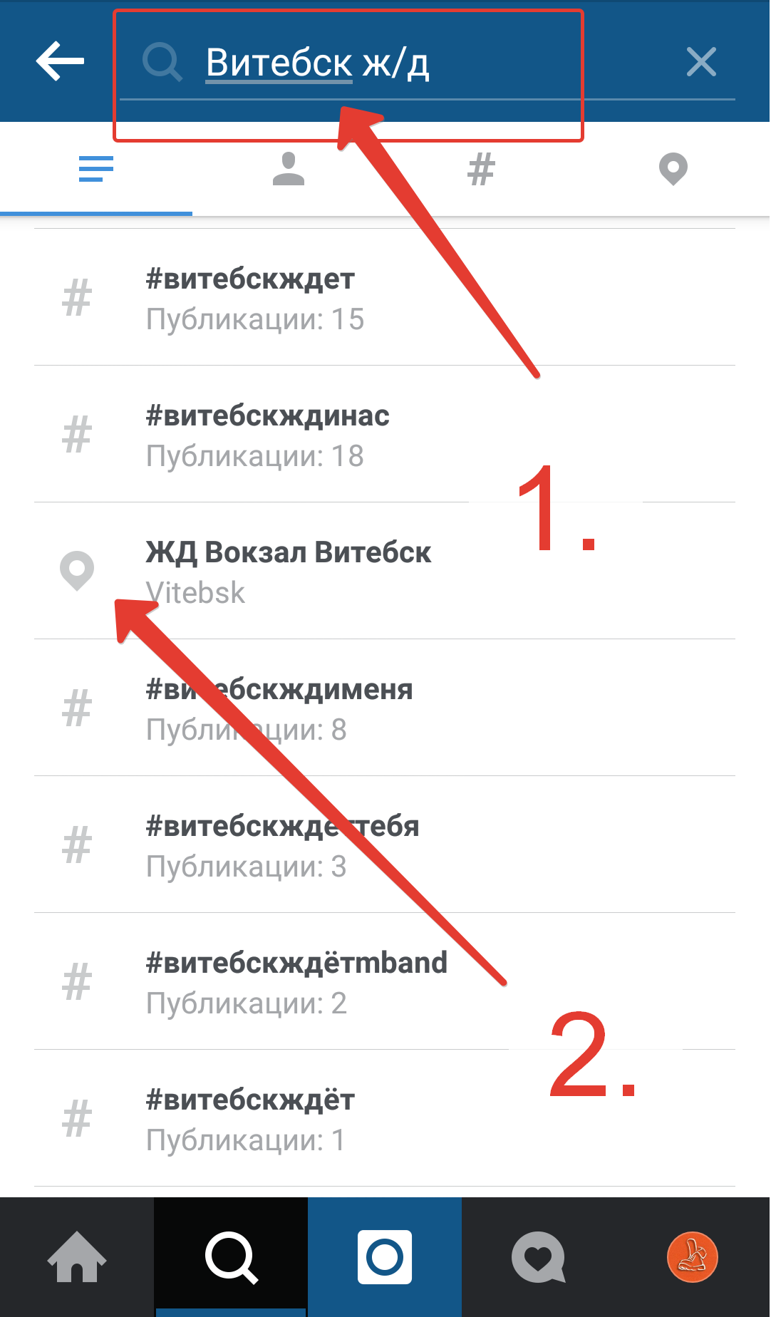 - Включаем на телефоне Instagram и переходим во вкладку поиск, где набираем название места, например Витебск ж/д вокзал