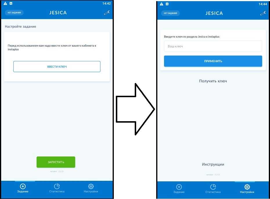В instaplus в разделе https://instaplus.me/jesica скопируйте ключ. В приложении Jesica нажмите «Веси ключ», вставьте в свой ключ и нажмите на «Применить».