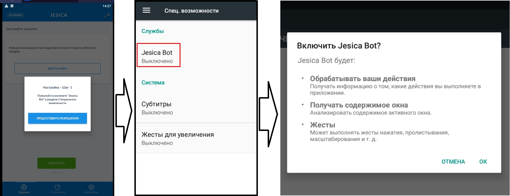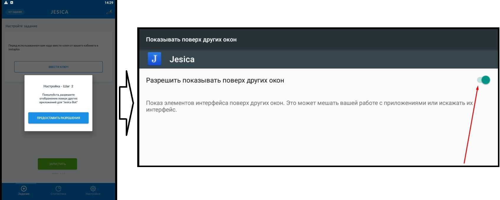 Вам предложат «Предоставить разрешение отображения поверх других приложений для Jesica Bot» -> ОК.