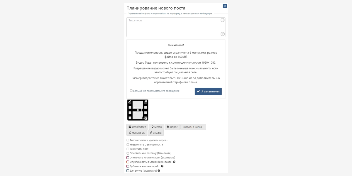 Если нужно опубликовать видео в Истории ВК, отметьте соответствующий пункт. Вы можете запланировать автопостинг всего контент-плана и уделить больше времени другим задачам.