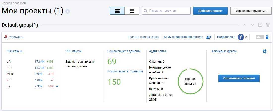 Чтобы добавить проект, необходимо нажать «Добавить проект» и ввести данные, в том числе URL-адрес веб-сайта, название проекта и группу, в которую вы хотите поместить свой проект. Процесс займет менее 5 минут, и вы можете просматривать данные, такие как: ключевые слова SEO и PPC, ссылающиеся домены и страницы. Также, сможете начать аудит сайта.