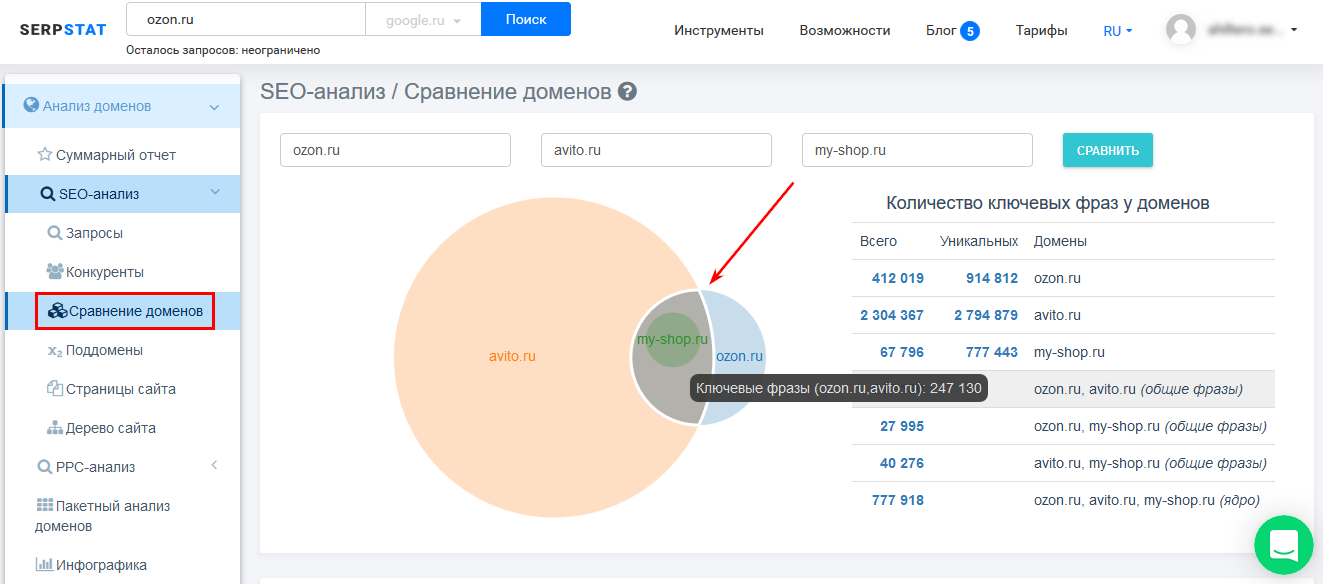 Этот анализ позволяет узнать, насколько семантика нашего домена отличается от конкурентов в количественном плане. Также получаем информацию по общим ключам для всех трех сайтов.