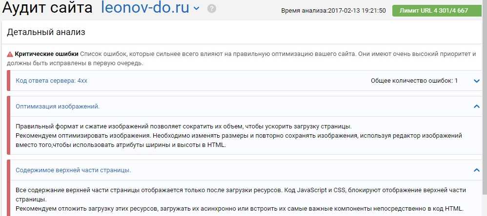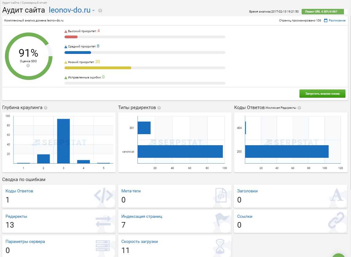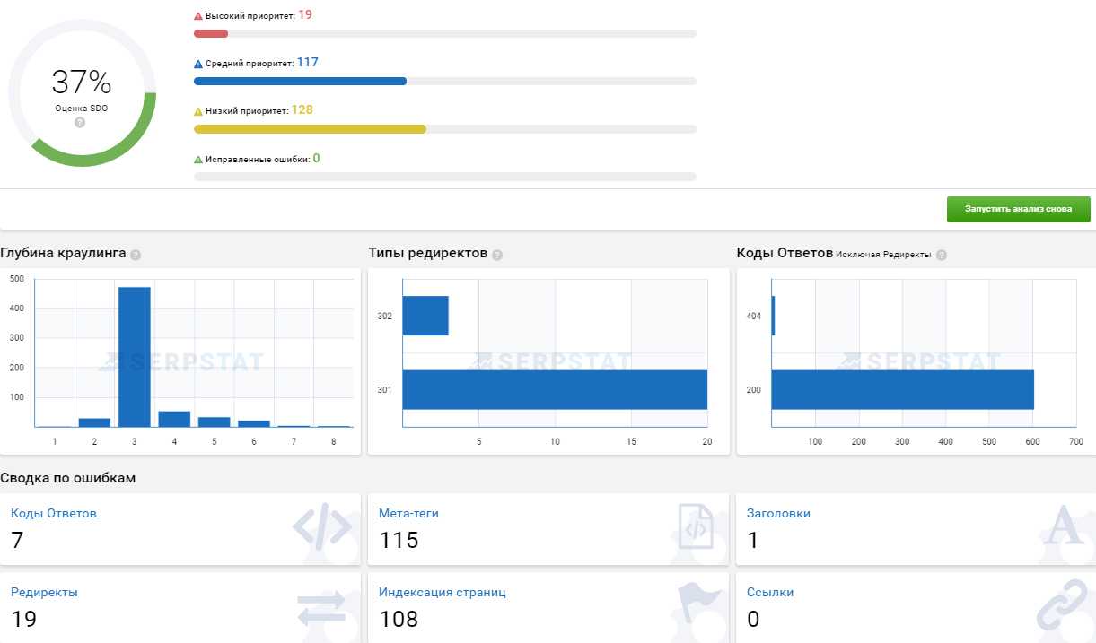 Это параметр, с помощью которого можно определить качество оптимизации ресурса. На платформе легко найти ошибки, которые тормозят работу сайта и его продвижение. На этом этапе система проверяет целесообразность мета-тегов, ссылок, редиректов, заголовков разных уровней, коды ответов страниц, скорость загрузки, параметры, индексацию.