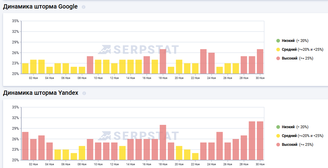 Кроме того, в данном разделе можно узнать динамику шторма в Яндекс и Google.