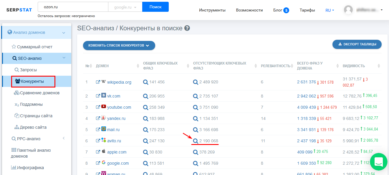 Введите в Serpstat название домена. Перейдите в раздел «Конкуренты» в меню «SEO-анализ» и «PPC-анализ». Выберите из списка двух — трёх основных конкурентов.
