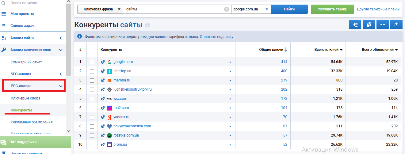 Например, в пункте PPC-анализ» есть полезные инструменты для тех, кто использует контекстную рекламу, с целью привлечения трафика на сайт. Если ввести ключевое слово в строку поиска, то вы можете получить данные, которые относятся к нему, а также к конкурентам. Это хорошая возможность проанализировать стратегии размещения рекламы ваших конкурентов, а также проанализировать пробелы в собственных рекламных компаниях. С помощью данной функции можно улучшить позиции публикаций для большего охвата целевой аудитории.