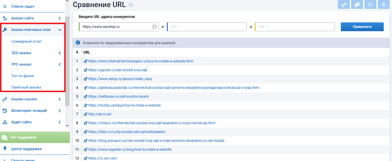 Для того чтобы заполнить поля URL, щелкните адреса на выбранных вами конкурентах.