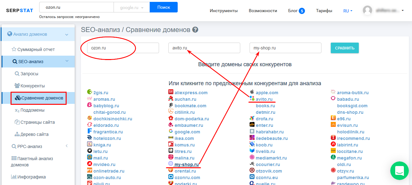 Чтобы провести подробное сравнение с соперниками в поиске, переходим в раздел “Сравнение доменов”. Здесь выбираем или вбиваем вручную конкурентов, которые интересны для сравнения.