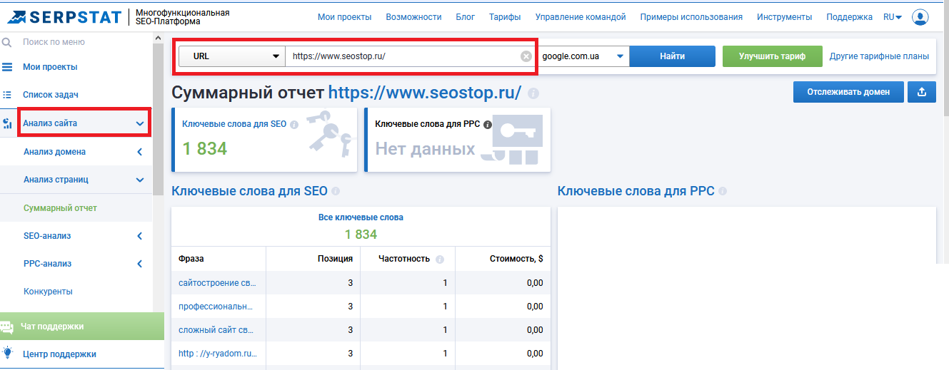 С аудитом сайта все понятно, предлагаю посмотреть на другие возможности платформы SERPSTAT, отвечающие за комплексный анализ сайта.