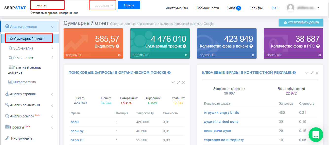 Пришла очередь провести анализ сайта. Для этого вводим исследуемый домен (в нашем примере ozon.ru), и выбираем поисковую систему. Попадаем на страницу “Суммарный отчет”. Она дает представление об общих сведениях по домену.