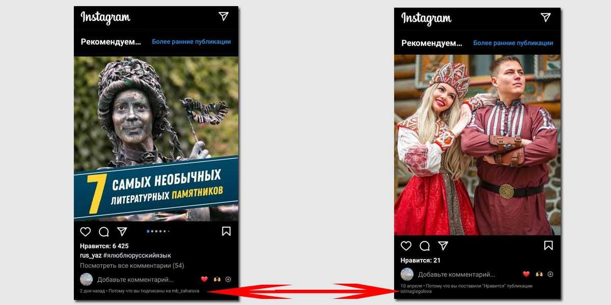 Инстаграм изучает схожесть профилей и постов между собой — одинаковые теги, ключевые слова в текстах, схожие элементы на снимках и так далее