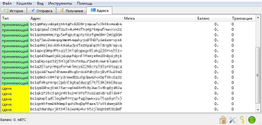 Во вкладке «Адреса», хранятся все связанные с кошельком Биткоин адреса.