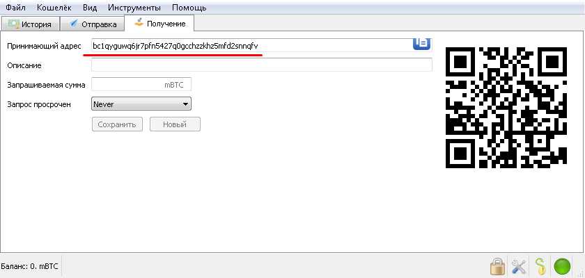 С помощью вкладки «Получение» можно запросить платеж, указав принимающий адрес с QR-кодом.