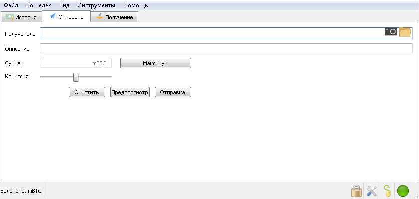 «Отправка» отвечает за отправку биткоинов. Здесь указывается не только адрес получателя, но и указывается размер комиссии за транзакцию.