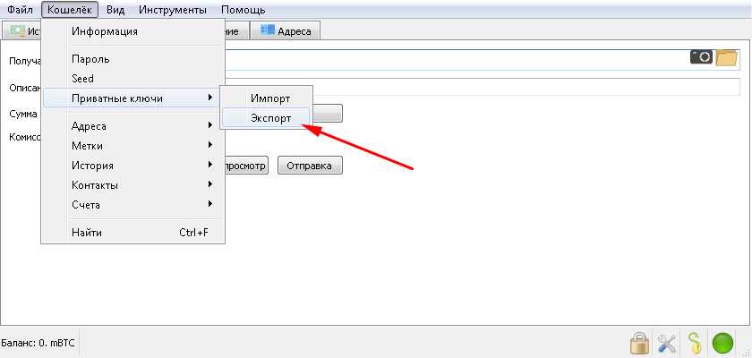 Кстати, не забудьте произвести экспорт приватных ключей сразу после установки кошелька.Приватный ключ — это по сути доступ к вашему кошельку, как ПИН-код от банковской карты и если он попадет в чужие руки, то можно потерять все хранящиеся в нём биткоины. Экспортировать приватные ключи можно перейдя по вкладкам: Кошелёк ⇒ Приватные ключи ⇒ Экспорт.