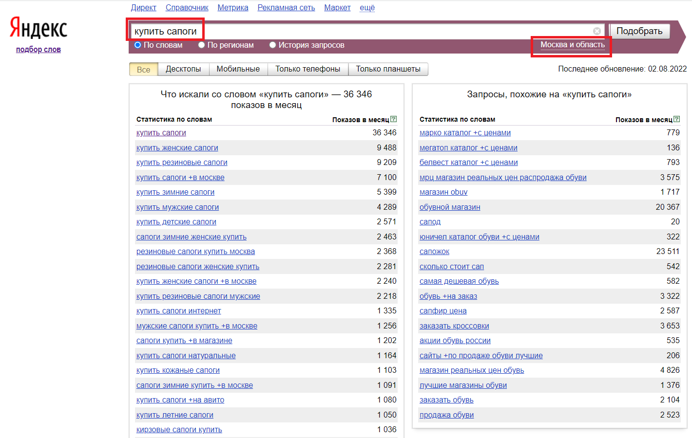 В поисковую строку нужно ввести ключевое слово, которое соответствует тематике сайта, под поисковой строкой — указать нужный регион, а затем кликнуть на кнопку «Подобрать».