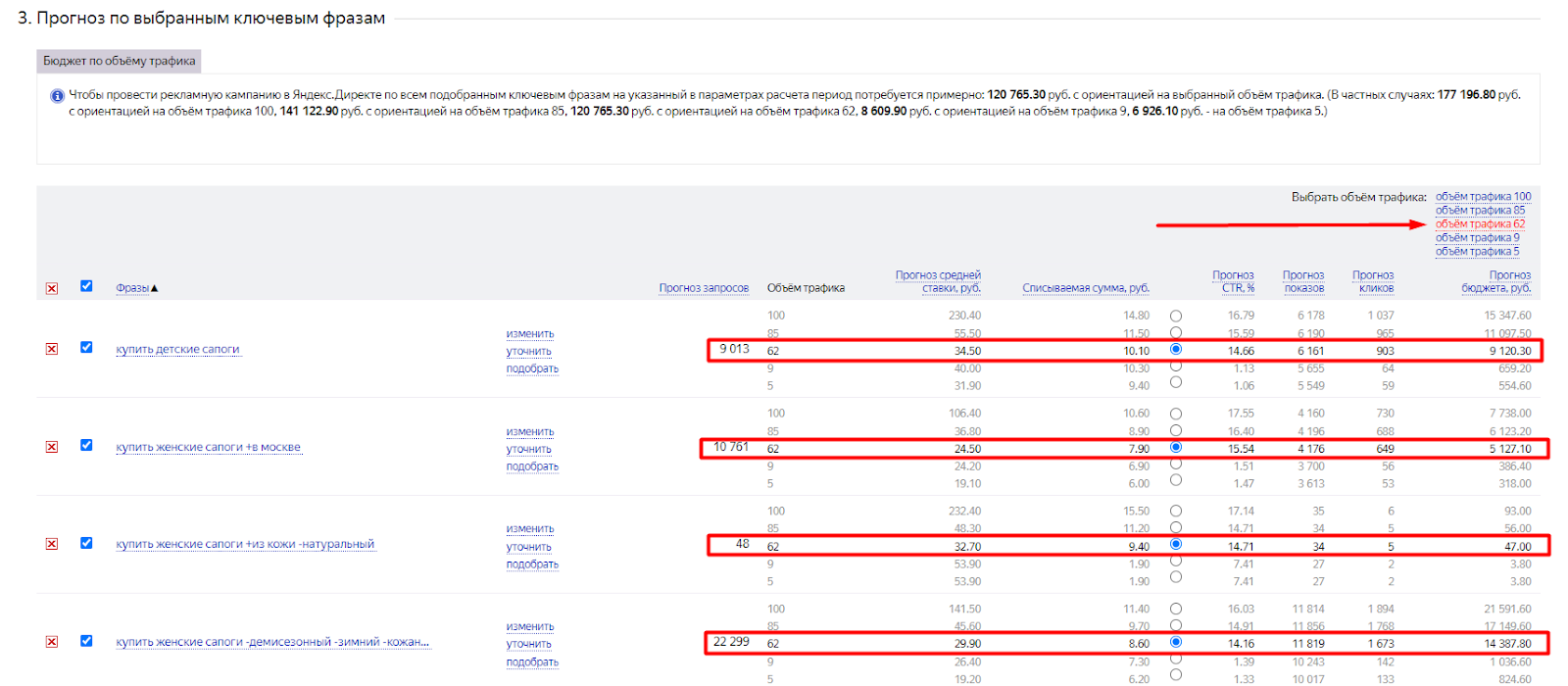 На старте лучше ориентироваться на объем трафика 62. Это показы примерно на третьей—четвертой позиции на верху поисковой выдачи.