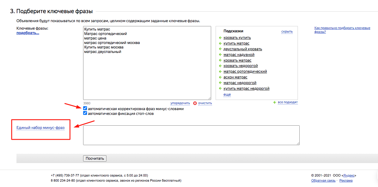 Если вы уже составили семантику в полном объеме, можете ее использовать. Но если вы еще не нашли ключевые слова или не уверены в них, воспользуйтесь подсказками Яндекс.Директа. В обоих случаях вы можете ознакомиться с нашим материалом по подбору ключевых слов. С ним будет проще работать при создании кампании.