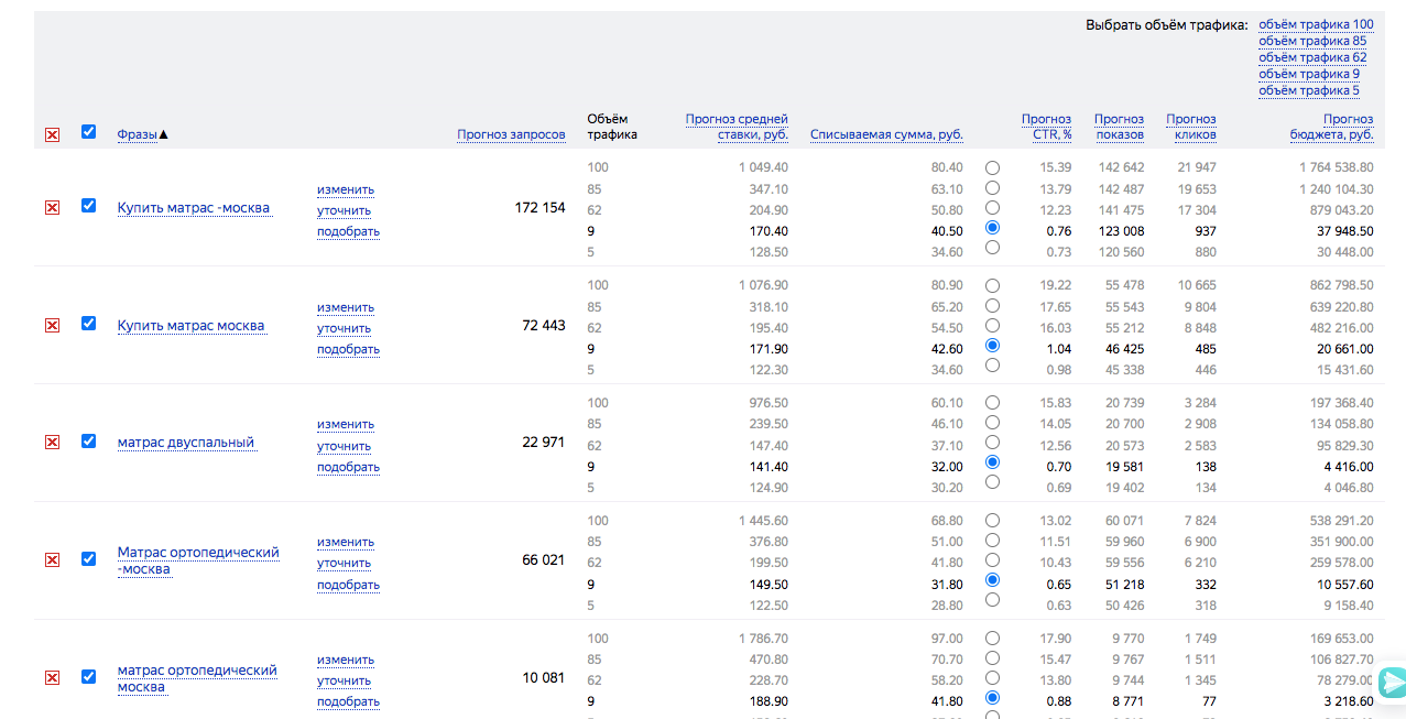 - Вы получите таблицу результатов с оценкой стоимости. Средняя сумма зависит от процента пользователей, которых вы хотите охватить. Например, в нашем примере для первой фразы «Купить московский матрас» охват 100% пользователей будет стоить 80,4 рубля. А при 9% охвате уже в 2 раза меньше — 40,5 руб.