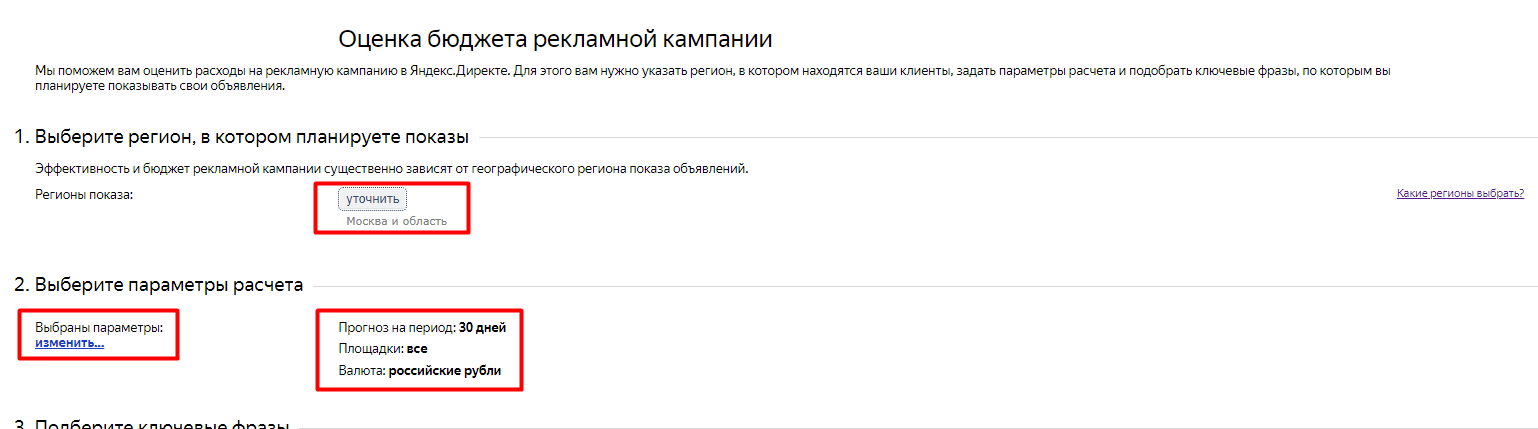 Как правило, данные значения при расчете стоимости цены клика в «Прогнозе бюджета» стоят по умолчанию.