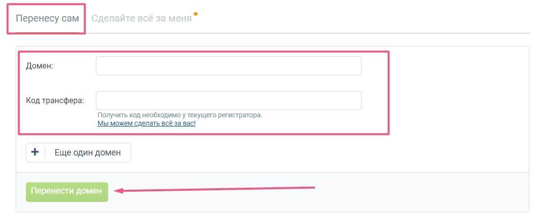 3. Если хотите сделать все самостоятельно, выберите вкладку «Перенесу сам». Укажите домен и код трансфера (его вы найдете в настройках домена у прошлого регистратора). Нажмите «Перенести домен».
