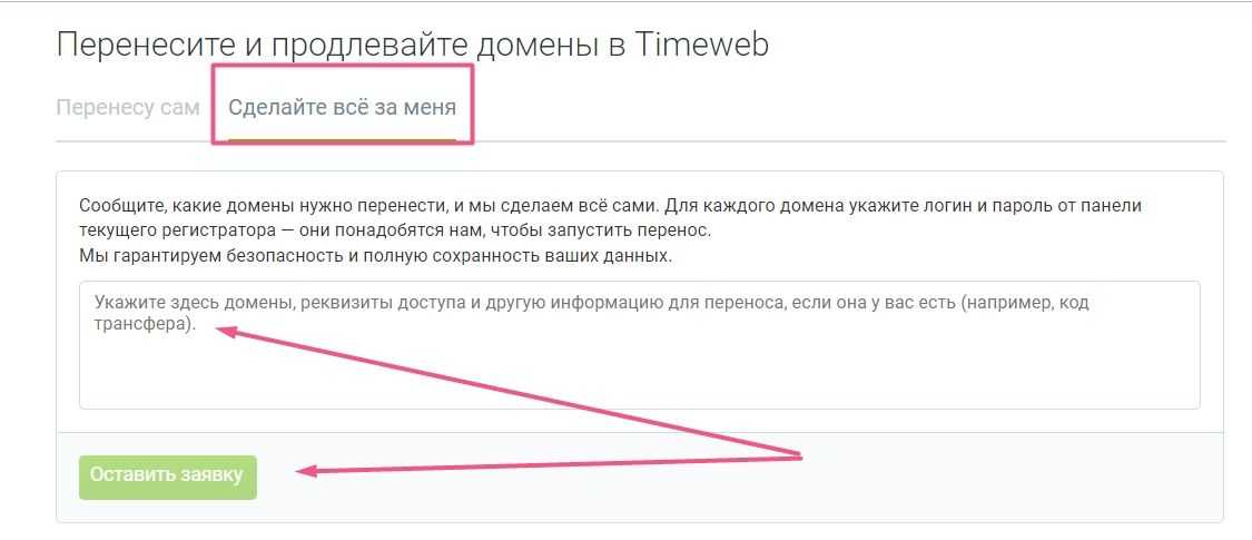 2. Если нужна помощь техподдержки, нажмите «Сделайте все за меня». Далее в пустом поле укажите домены, которые нужно перенести, и доступы к панели управления у прежнего регистратора. Нажмите «Оставить заявку».