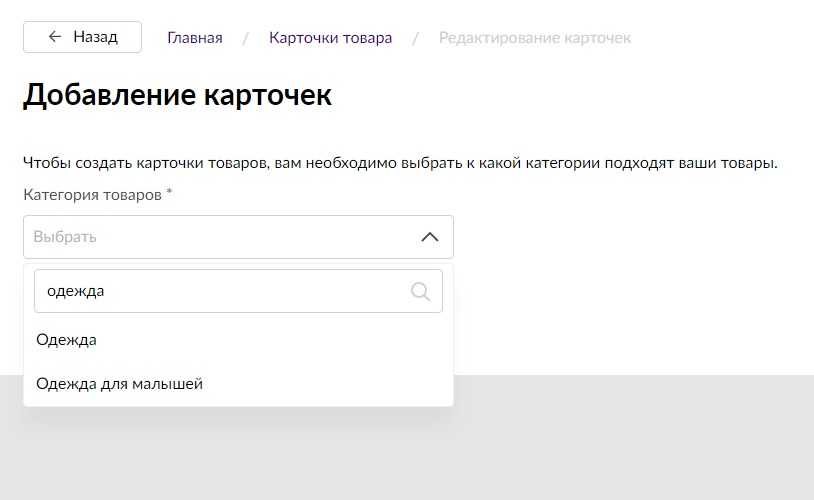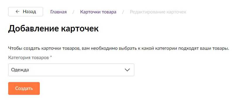 Когда определился с категорией можешь переходить к созданию карточки товара. Первое, что Вайлдберриз попросит тебя заполнить, как раз категория.