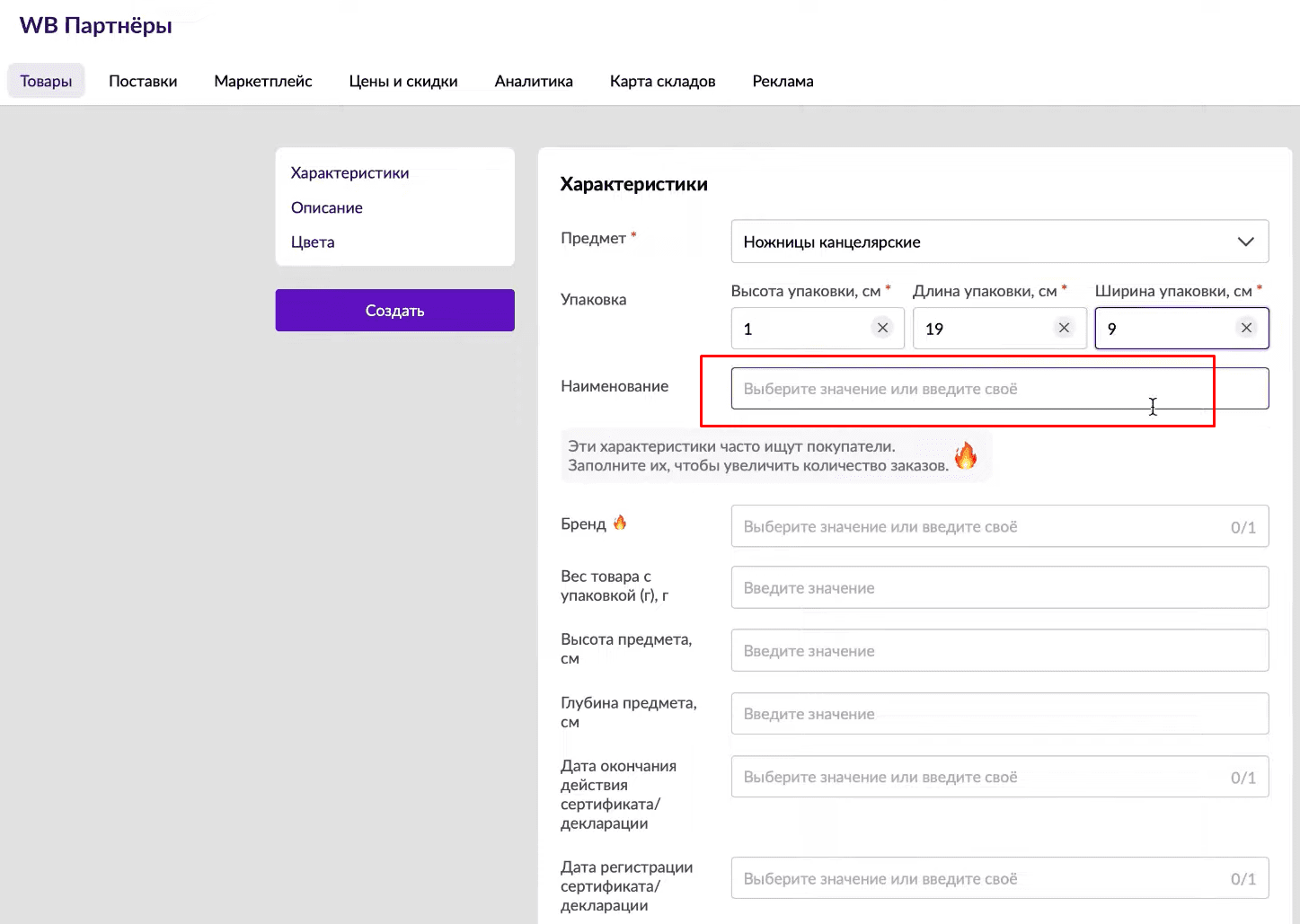 Это важный пункт, где лучше заполнять все ячейки, а не только те, что помечены обязательным «огоньком». Чем больше информации о товаре вы укажете, тем чаще карточка будет высвечиваться в поиске.