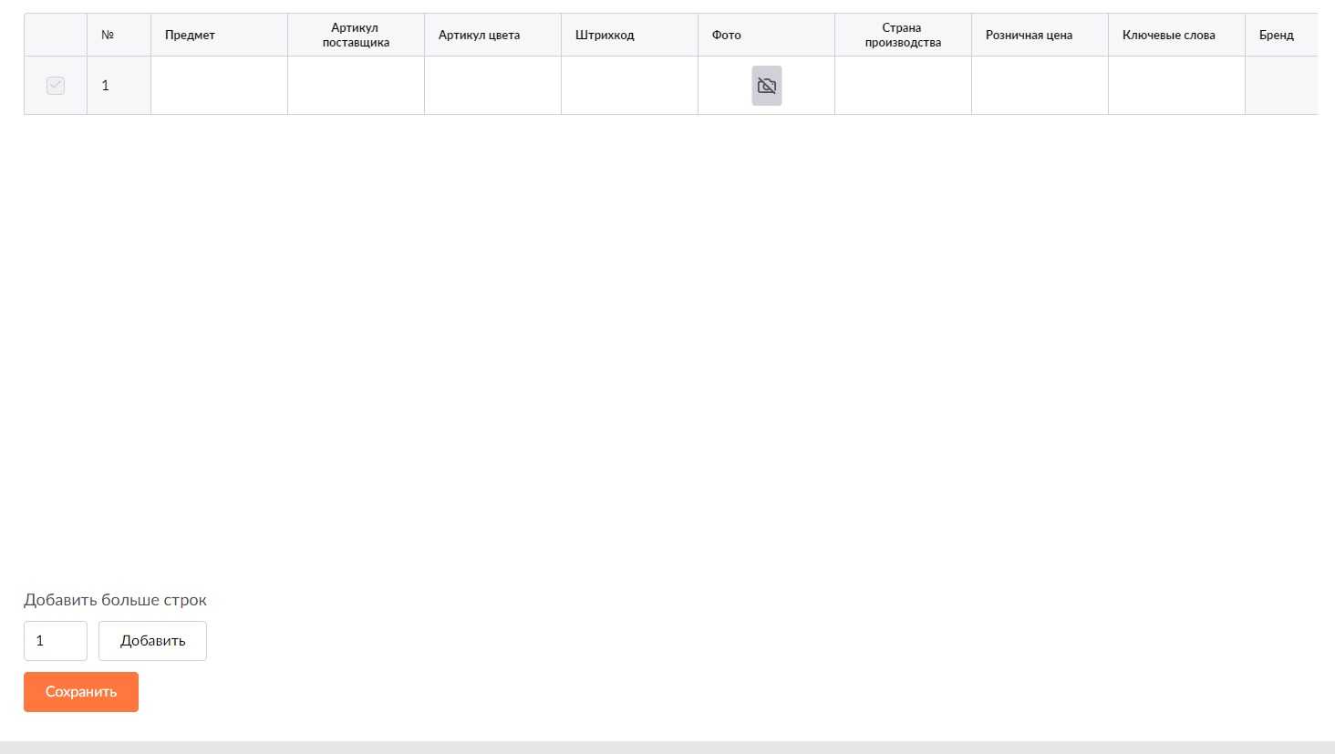 Нажимая кнопку «Добавить», делаем в таблице столько строк, сколько товаров нужно добавить. После этого заполняются все ячейки таблицы. Далее жмем «Сохранить» и система создает нужно количество карточек. Теперь можно переходить к вводу данных: