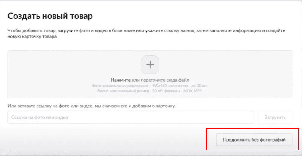 Если визуал для новой карточки пока не готов, нажмите кнопку «Продолжить без фотографий».