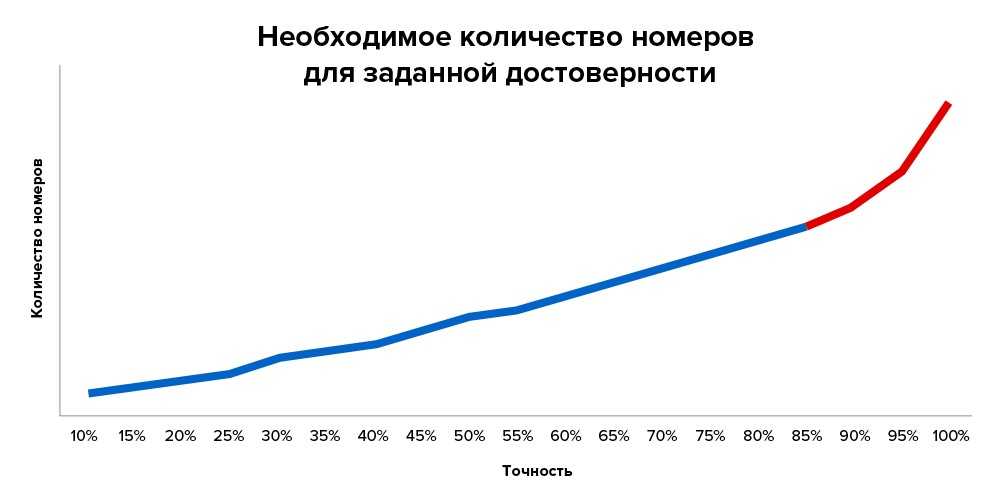 На графике ниже приведена зависимость достоверности определения источника от количества зарезервированных номеров. Само количество номеров зависит от количества пользователей, но мы хотим показать, как резко возрастает количество необходимых номеров при требуемой точности выше 90% (отмечено красной линией). Как следствие, резко возрастет и стоимость. В большинстве случаях точности в 80-90% вполне хватает, чтобы эффективно оценивать работу рекламных кампаний, поэтому нет никакого смысла переплачивать за увеличение точности.