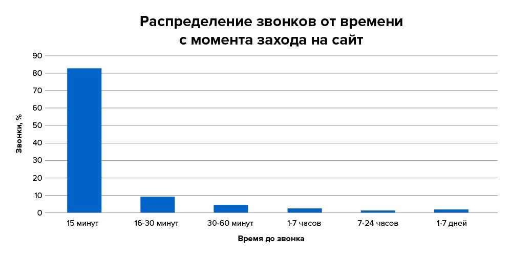 Для ориентировочной оценки времени закрепления номера можно использовать компании CoMagic, которое дает представление о том, через какое время после захода на сайт пользователи звонят. 82.4% посетителей звонят в первые 15 минут своего сеанса (см. рис. ниже). При этом большая часть пользователей совершают звонок в первые 5 минут своего посещения. В первые 30 минут звонят 91.4% пользователей. Это значит, что если мы будем закреплять номер за каждым посетителем сайта на 30 минут, то мы сможем отследить 91.4% всех поступающих звонков. Такая точность нас вполне устраивает, поэтому нет никакой необходимости присваивать номера на большее время, т.к. это приведет к увеличению стоимости коллтрекинга. Часто это время можно уменьшить в несколько раз без уменьшения точности, но это зависит от каждого конкретного сайта и продолжительности сеансов пользователей. С другой стороны, около 50% всех посетителей сайта являются отказниками, и на них закреплять телефонные номера не стоит.