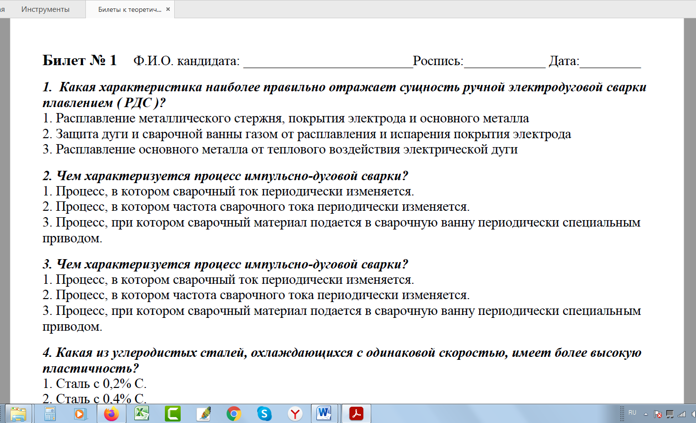 Билеты к теоретическому экзамену были взяты из вопросов, задаваемых сварщикам при аттестации НАКС и ничего нового для них не содержат. Если у вас нет сварных с НАКС-ом, то можете надергать вопросы по ТБ из производственных инструкций, пункты из строительных СНиП-ов, обязанности из ЕТКС. Если сами затрудняетесь, напишите мне в личку в ВК, помогу.
