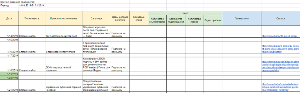 Другой актуальный вопрос – на какой период составлять контент-план? Минимум на две недели, максимум можно на месяц. Это позволит своевременно вносить правки, если будут появляться различные события, новости и прочие сведения. При этом не придется каждую неделю потеть над придумыванием плана.