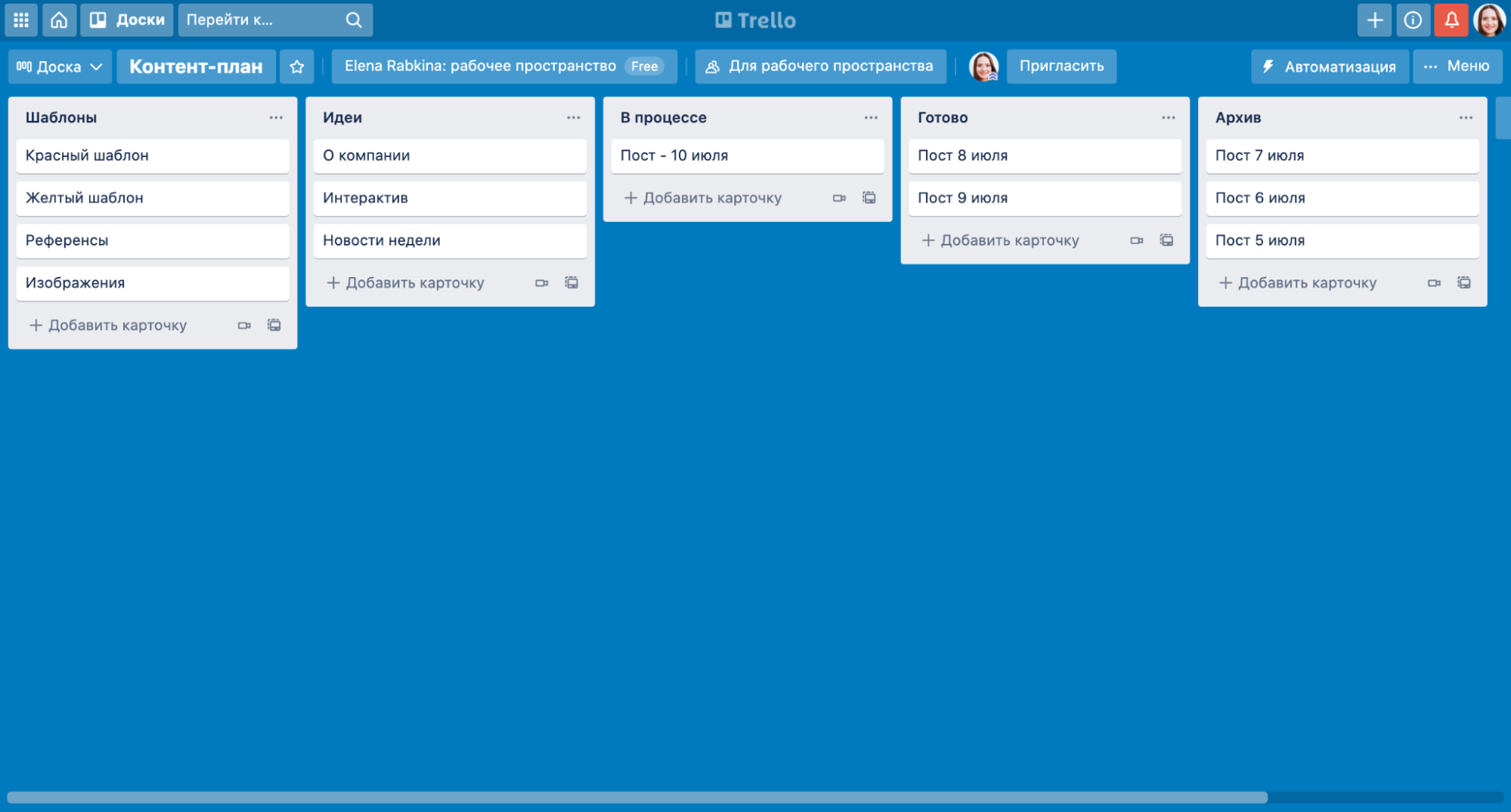 Данный сервис для планирования задач вполне подходит для работы с контент-планом. Конечно, тут не все так наглядно и понятно, как в таблицах. Но сервис имеет ряд преимуществ, дающих возможность организовывать команду под каждой карточкой и собирать много ресурсов воедино. Главное – создать стопки в соответствие с внутренними процессами компании, разместить списки задач, выставить дедлайны, ответственных и так далее.