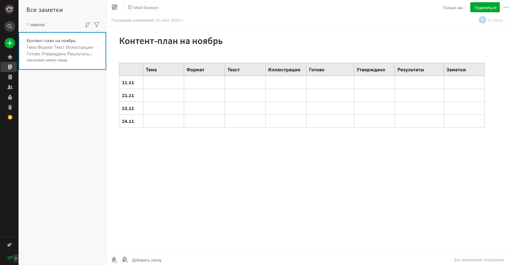 Данные здесь хранятся в формате заметок. В них можно добавлять не только текст, но и ссылки, таблички, картинки. Для удобства и наглядности сам пост помечайте разными цветами. Контент-план можно размещать на индивидуальных карточках или собрать все воедино.