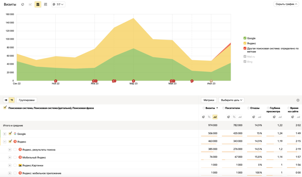 Метрика посещаемости сайта из поисковых систем показывает уровень видимости ваших материалов. Пользователь ищет что-то в интернете, видит вашу статью в ленте выдачи и переходит на нее. Это — бесплатный органический трафик, который дает большую часть просмотров вашего ресурса.