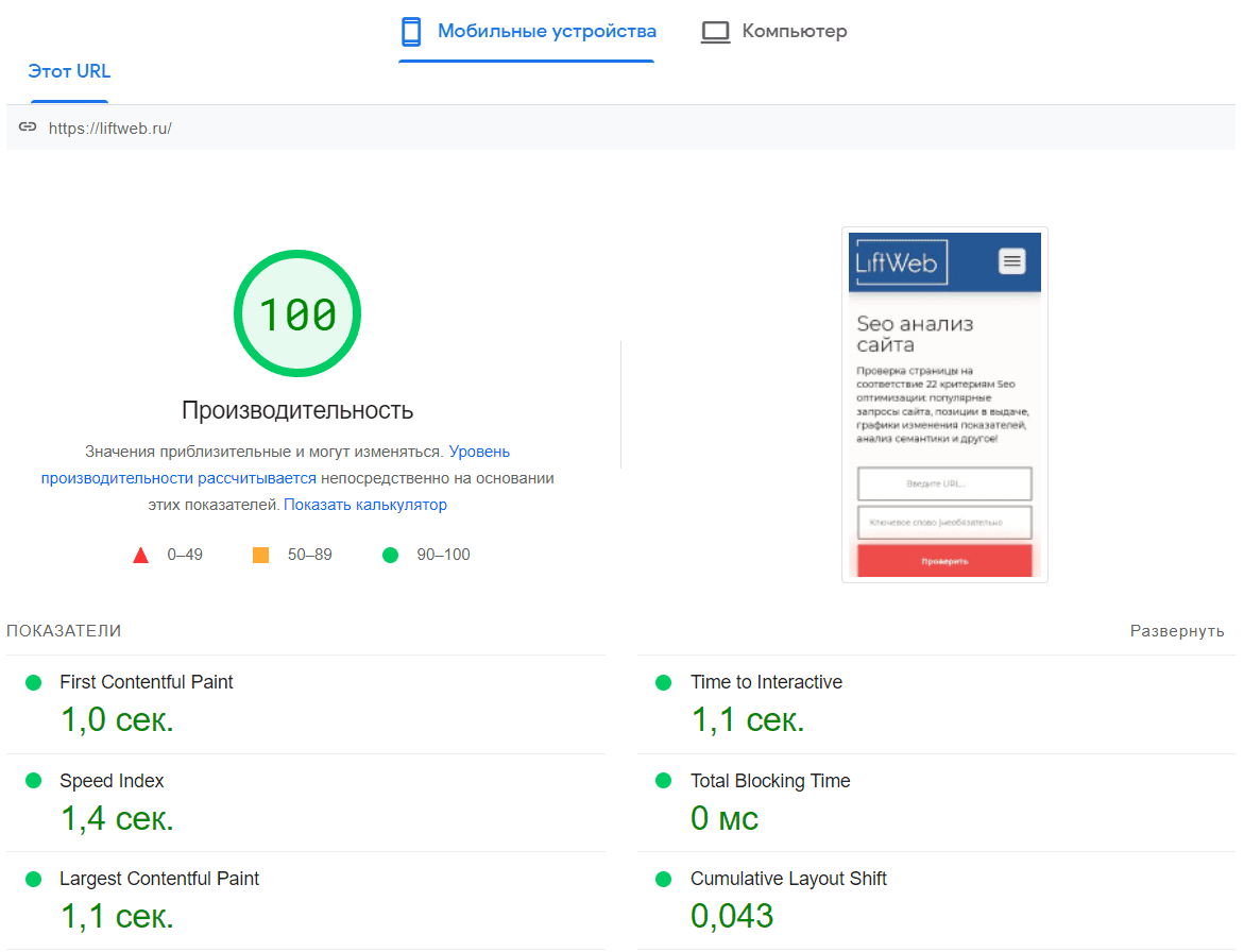 Это бесплатный инструмент от Google. Он удобен в использовании и относительно прост для понимания. Результат анализа выражается в виде баллов от 0 до 100. Хорошим считается показатель больше 80. Кроме этого данный сервис подскажет что необходимо исправить, чтобы скорость увеличилась.