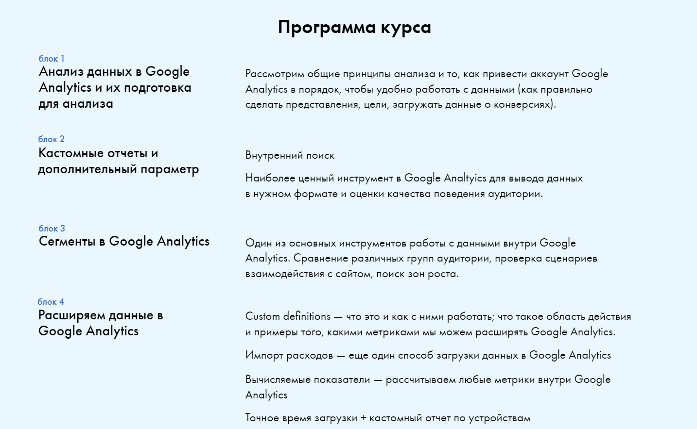от Андрея Осипова — сертифицированного спикера Google Partners. Программа рассчитана на студентов, которые уже имеют представление о веб-аналитике и хотят улучшить свои навыки. Курс состоит из восьми блоков и помимо теоретической информации включает практические задания, разбор реальных кейсов и финальное тестирование.