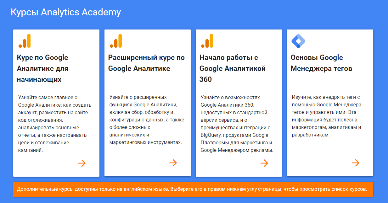 Обучение от команды Google позволит подробно изучить аналитические инструменты Google и применить полученные знания для развития бизнеса. Есть курсы для начинающих и продолжающих по Google Analytics, а также основы работы с Google Tag Manager и Google Analytics 360.