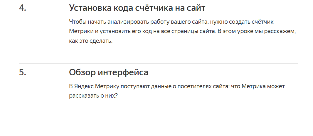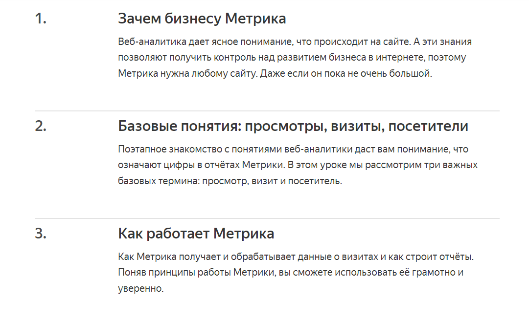 Небольшой курс из пяти лекций от команды Яндекса. Из него узнаете об основных понятиях в веб-аналитике (посетители, визиты, просмотры), разберетесь, как установить код счетчика на сайт и изучите интерфейс системы. В конце урока есть задания для самопроверки.