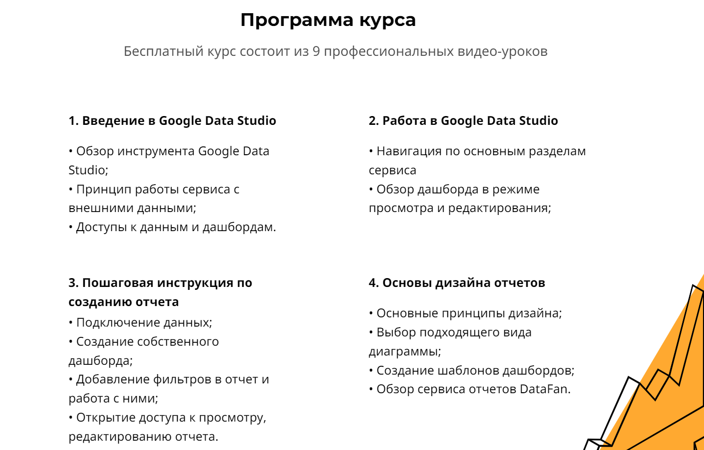 Курс состоит из 9 видеоуроков. В процессе обучения вы разберетесь с интерфейсом Data Studio,а после завершения сможете самостоятельно составлять отчеты по таргетированной рекламе и SMM.