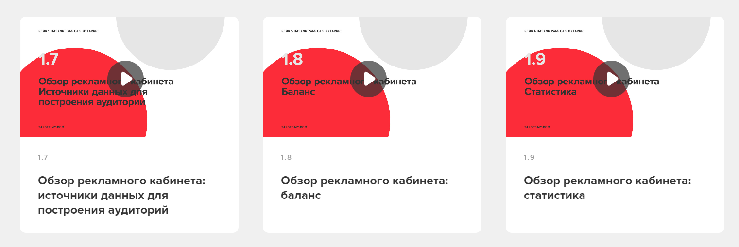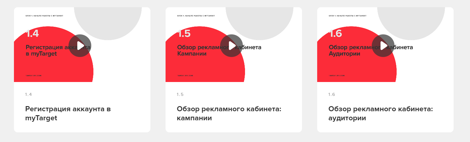 Специалисты myTarget подготовили 50 видеолекций и 24 текстовых урока. Они разделены на три блока по уровням: